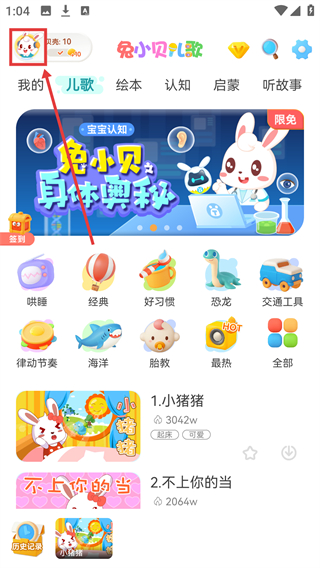 1、進入【兔小貝兒歌】主界面后,點擊左上角頭像按鈕。