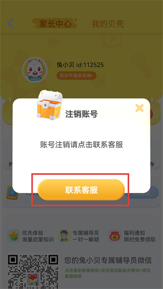 3、點擊【注銷賬號】后彈出彈窗,需點擊【聯系客服】按鈕處理。
