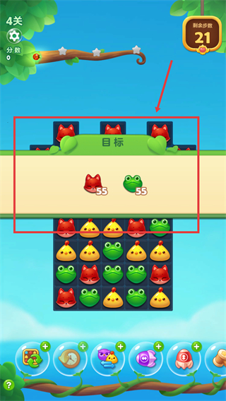 1、當(dāng)前目標(biāo)需收集【狐貍-55】與【青蛙-55】,剩余步數(shù)21,優(yōu)先消除目標(biāo)動物方塊,逐步積累進(jìn)度推進(jìn)關(guān)卡。
