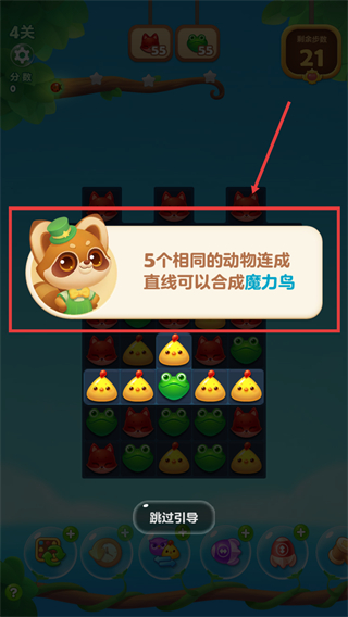2、嘗試將5個相同的動物方塊連成直線,可合成【魔力鳥】,借助其特殊效果能更高效完成收集任務(wù),提升消除效率。