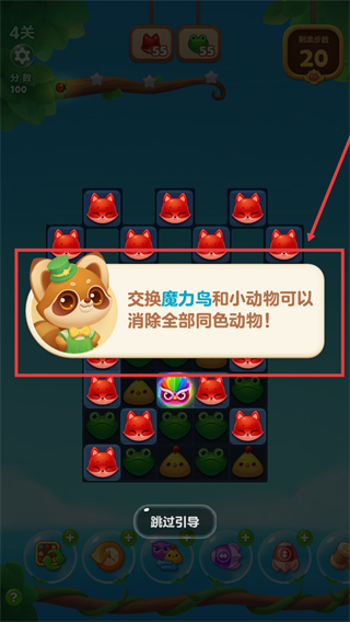 3、交換【魔力鳥】與任意小動物方塊,可消除場上所有同色動物,快速削減目標(biāo)數(shù)量,節(jié)省剩余步數(shù)。