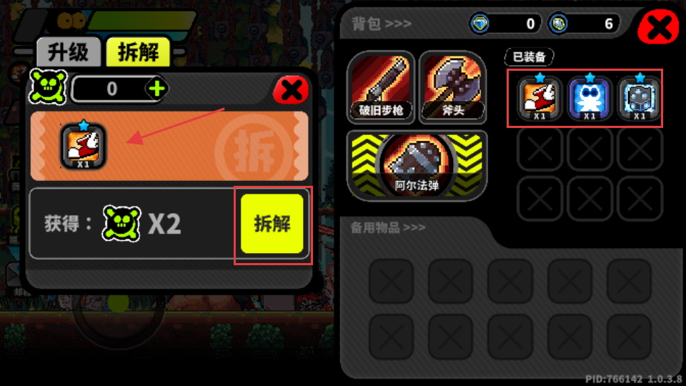 3、在背包界面選中物品,點擊【拆解】,可獲【X2】綠色骷髏材料,用于角色升級合成。
