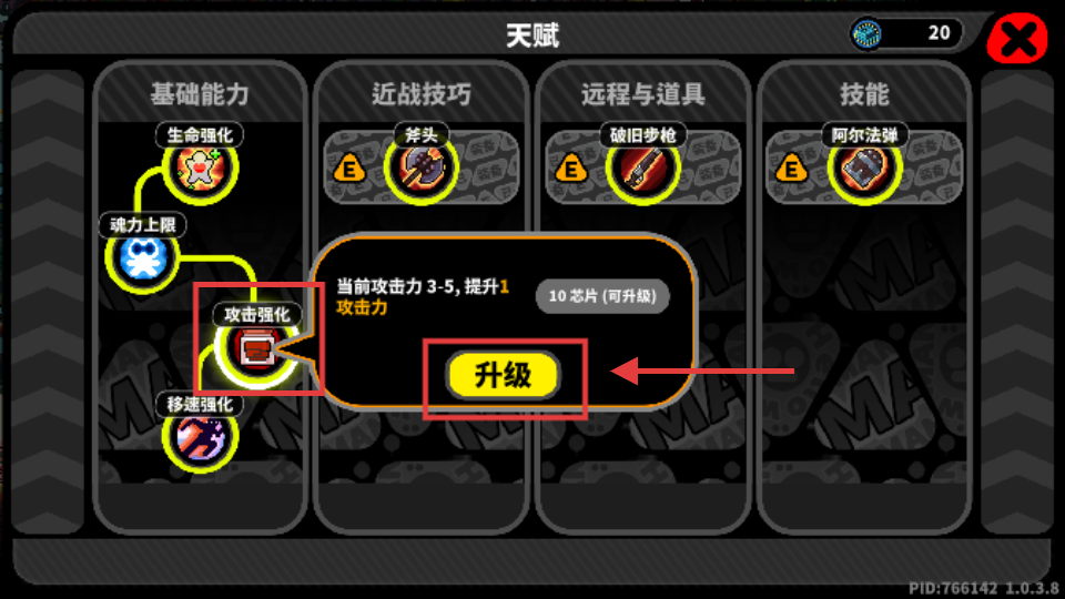 4、在天賦界面選【攻擊強化】,消耗【10】芯片點【升級】,提升攻擊力,增強戰斗能力。