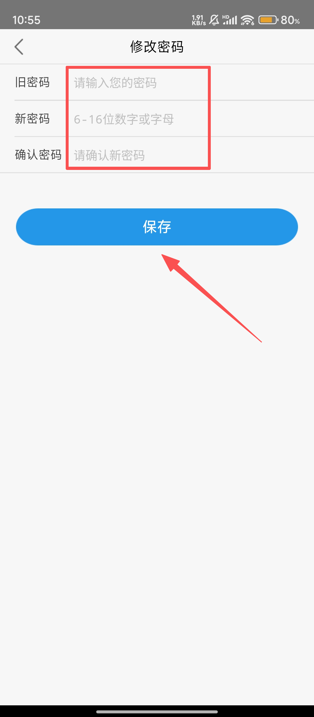 4、在【修改密碼】界面,依次輸入舊密碼、新密碼并確認,點擊【保存】,即可完成密碼修改,輕松登錄啦。
