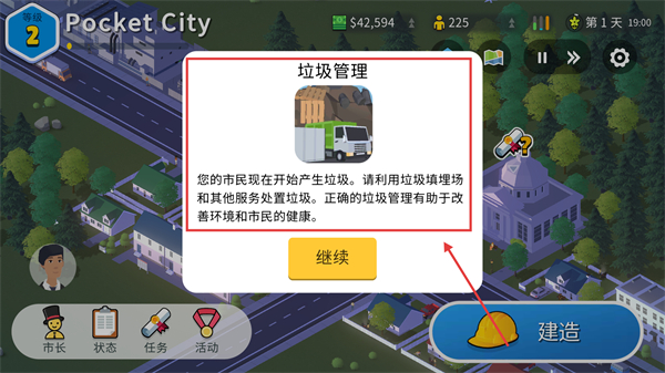 2、在市政府大廳接取任務,規劃城市功能分區,劃分住宅、商業、工業區,避免混合降低效率。