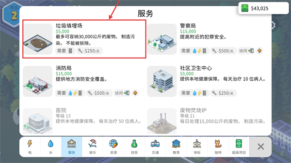 2、服務菜單中的【垃圾填埋場】成本5000,日維護250,最多容納30000公斤廢物但制造污染。