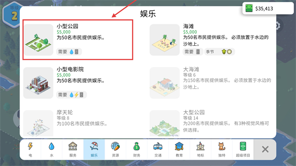 3、娛樂類的【小型公園】成本5000,為50名市民提供娛樂,建造時注意滿足用水需求。