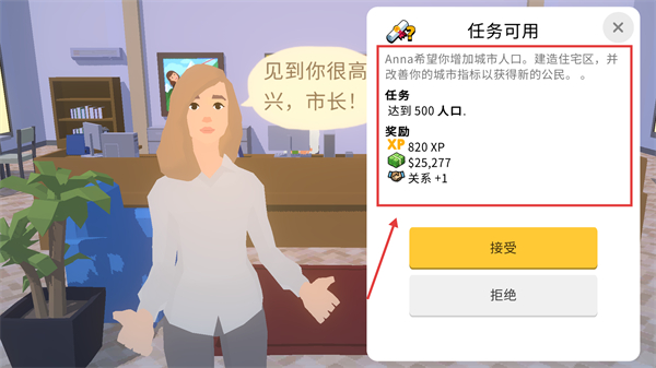 4、接受Anna的任務,建造住宅區并提升城市指標至500人口,可獲820XP與25277金幣獎勵。