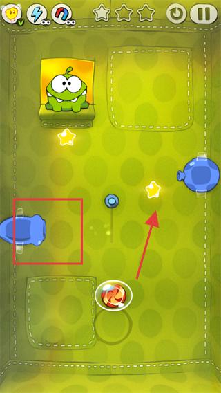3、切斷懸掛糖果的繩子,讓糖果落在氣泡上,借助氣泡的浮力向小怪獸方向移動(dòng),同時(shí)收集星星。