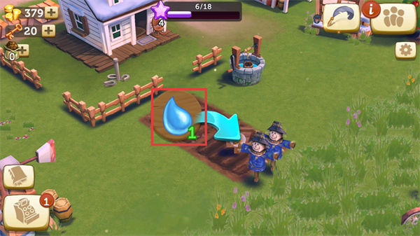 2、點(diǎn)擊【水滴圖標(biāo)】道具,將其應(yīng)用到種植小麥的農(nóng)田,為小麥生長提供水分支持。