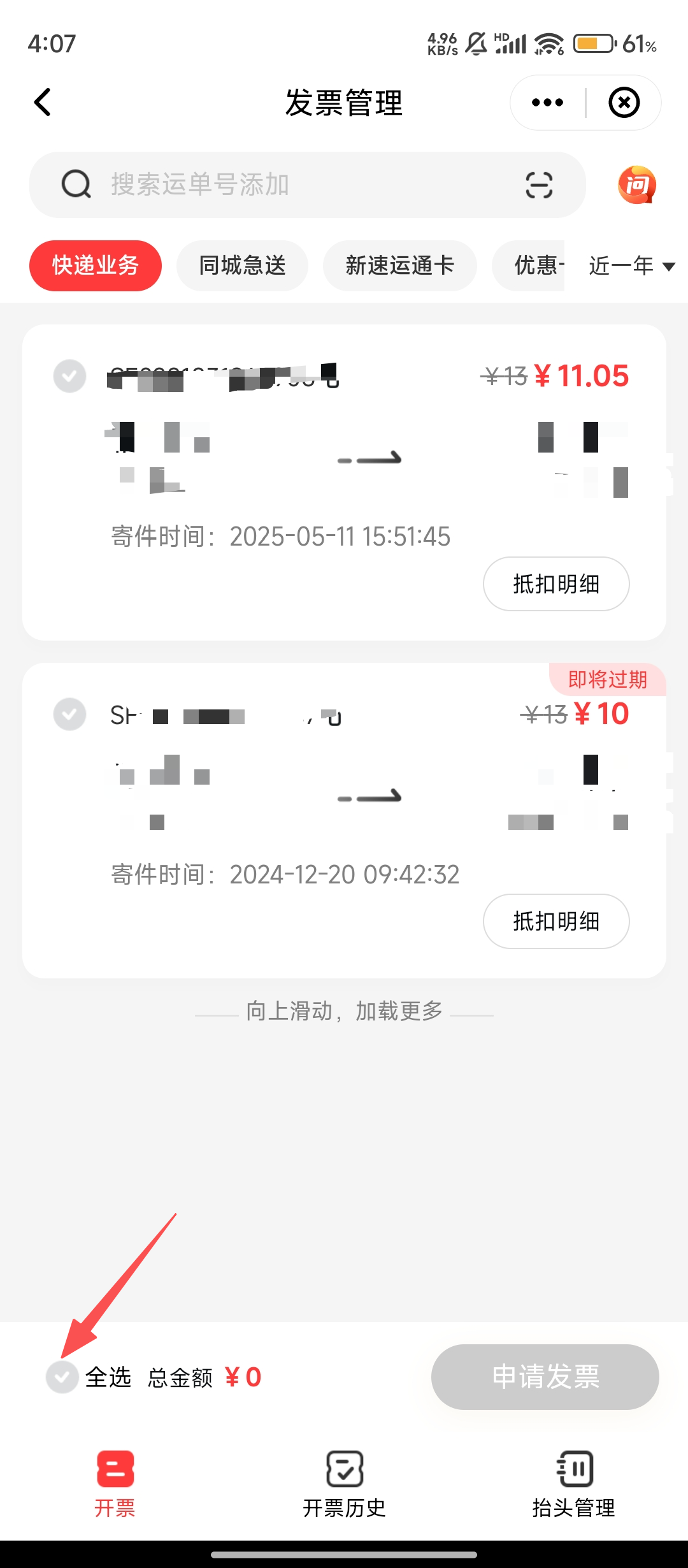 3、進入發票管理頁,點擊【全選】,把要開票的運單都選中,操作起來很是順暢呢。
