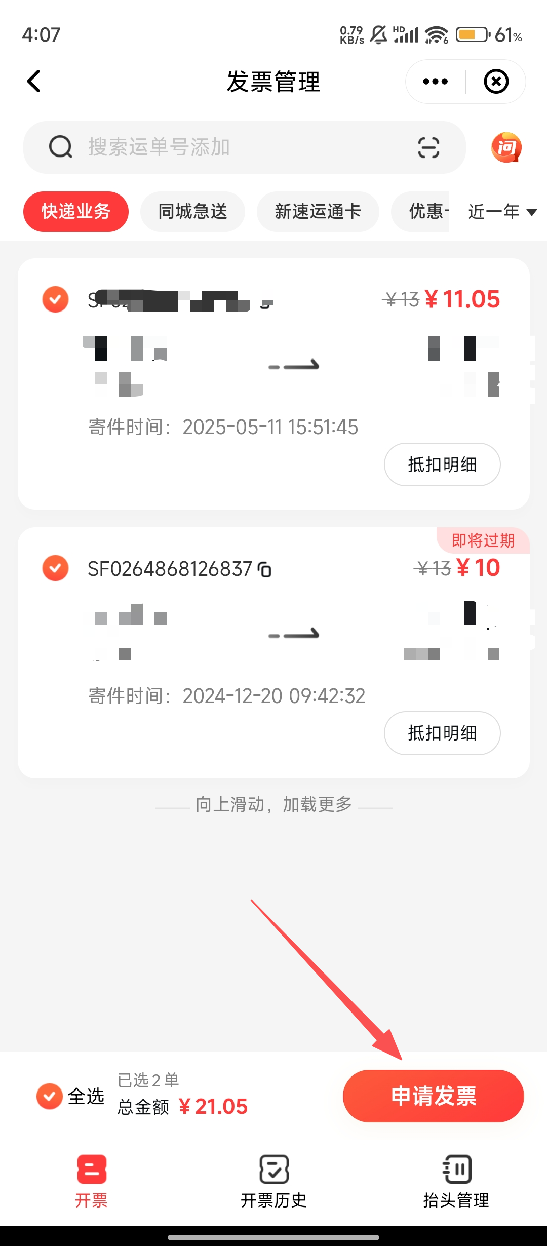 4、選好運單后,點擊【申請發票】,就能完成發票申請,整個流程清晰又高效哦。