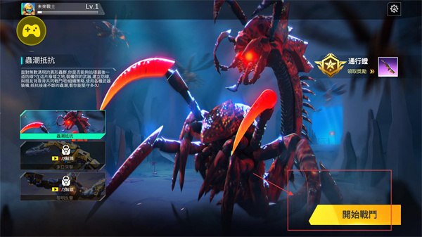 1、在“鹽湖抵抗”任務界面,查看敵方(巨型蟲類)信息后,點擊“開始戰鬥”進入對局,可先選擇左側推薦裝備提升戰斗能力。