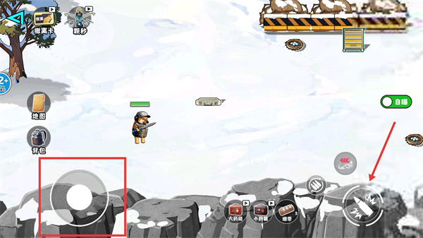 2、雷達站游戲場景,紅色框標移動搖桿,箭頭指向攻擊按鈕。