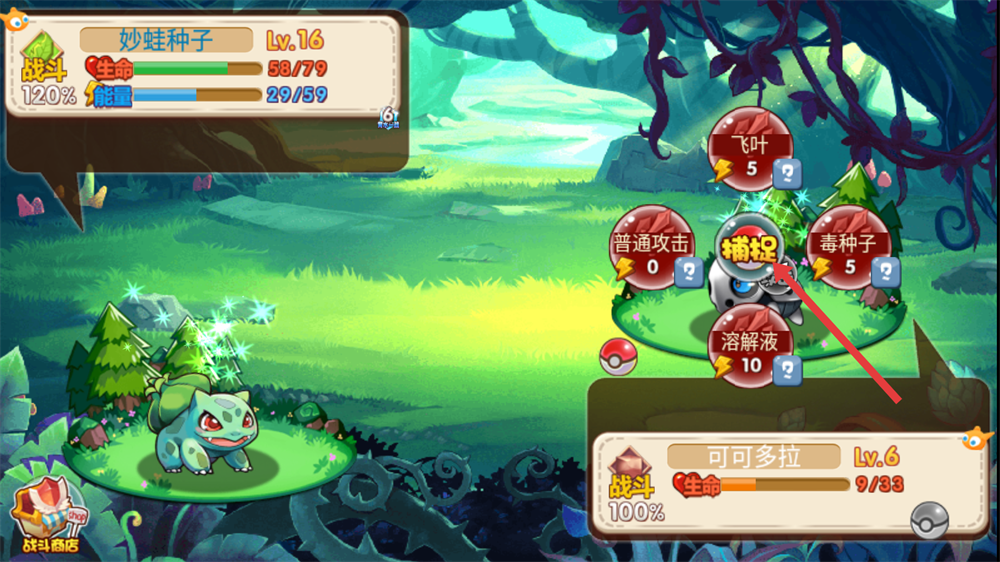 1、對(duì)戰(zhàn)時(shí)釋放【毒種子】技能,消耗可可多拉血量,為后續(xù)捕捉鋪路,這步可得用心哦。