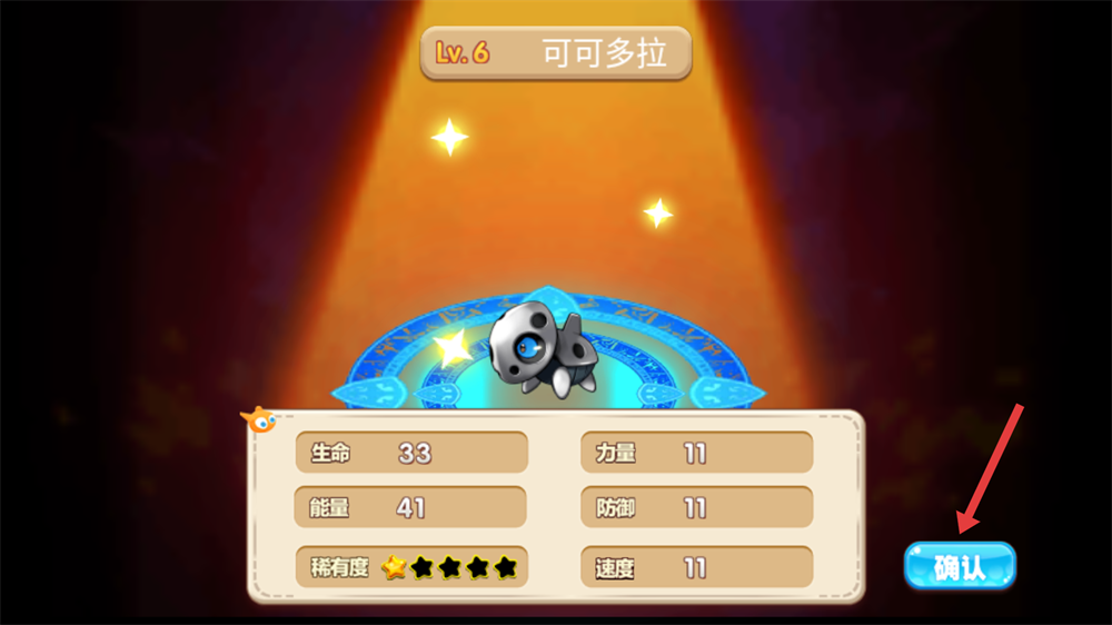 4、成功捕捉后點(diǎn)擊【確認(rèn)】,把可可多拉收錄進(jìn)隊(duì)伍,精靈陣容又添新成員啦。