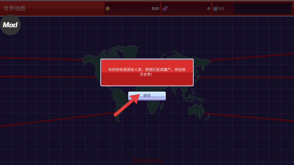 4、明確目標是感染人類變僵尸毀滅世界,點擊【繼續】,推進游戲進程。