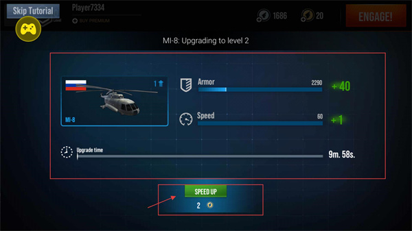 4、升級界面中,MI-8直升機升級至2級可提升護甲與速度,消耗資源可加速升級流程,升級后作戰能力將顯著增強。