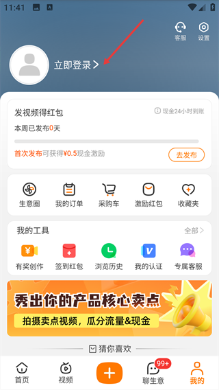 2、在個人中心頁面,點擊“立即登錄”按鈕。
