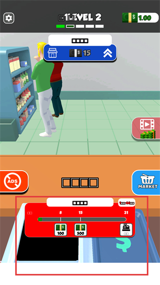 1.簡單幽默的繪畫風格,卡通人物造型,營造輕松休閑的游戲氛圍,看能否完成所有級別的超市收銀員