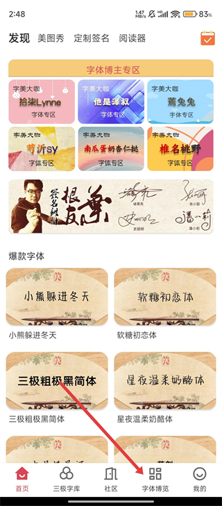 1、打開【字體美化大師】軟件,我們點擊底部的【字體博覽】選項進入頁面哦。