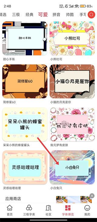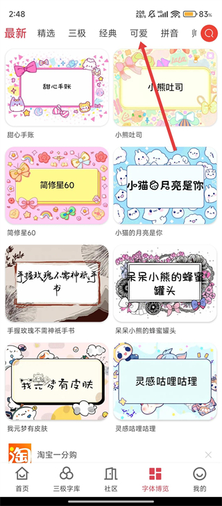 2、在字體博覽頁,我們點擊【可愛】標簽切換到對應字體分類呢。