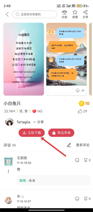 3、還可以預覽字體樣式,如果喜歡的話,點擊下方立刻下載即可成功應用字體。