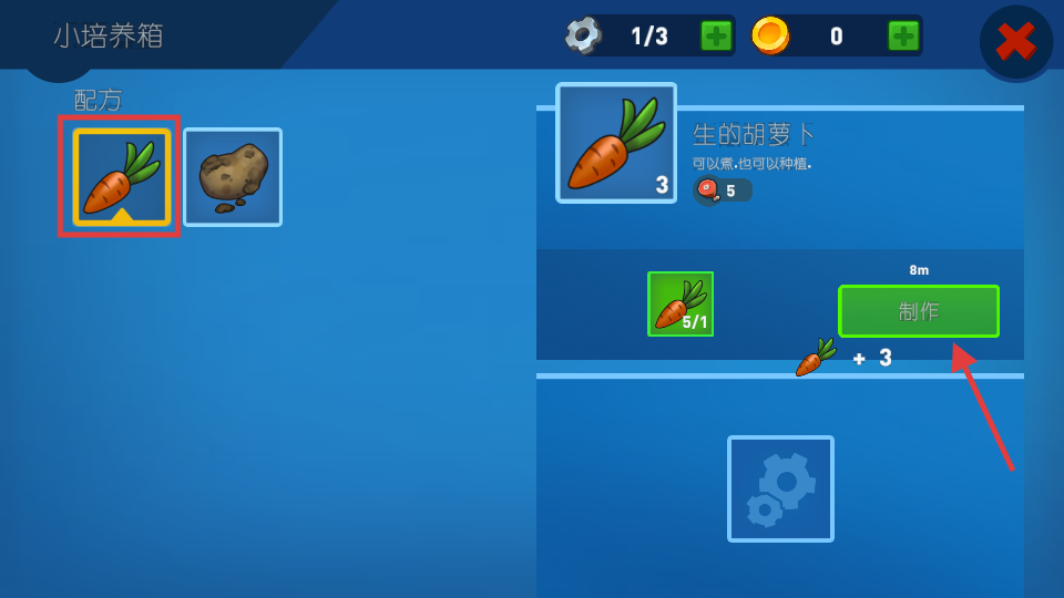 3、在小培養箱中選擇【生的胡蘿卜】配方,消耗【生的胡蘿卜】3個,點擊制作可獲得【生的胡蘿卜】3個,用于種植或烹飪。