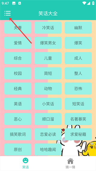 1、打開笑話大王全集,在【猜一猜】頁面點(diǎn)擊【搞笑】分類。