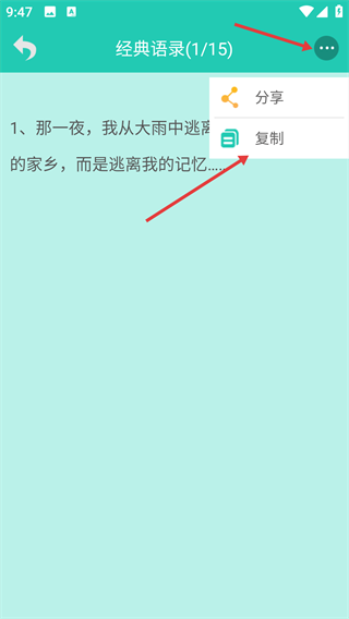 4、在語錄詳情頁,點(diǎn)擊右上角更多按鈕,點(diǎn)擊“復(fù)制”按鈕,完成復(fù)制操作。