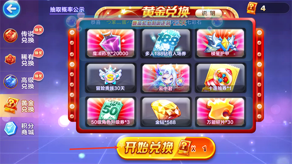 1、在黃金兌換界面,消耗【黃金獎券】可兌換【魔法藥水】【棱星護甲】等獎勵,點擊開始兌換即可參與。