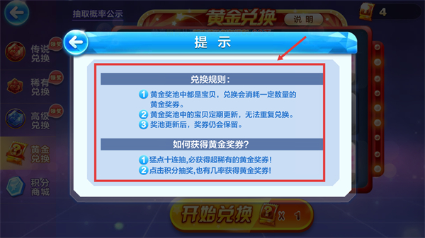 2、兌換前查看規則,獎池消耗【黃金獎券】且定期更新,獎券可通過十連抽或積分抽獎獲取。