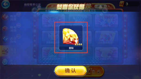 3、兌換后若獲得【金鉆】【588】,點擊確認按鈕領取,可用于后續游戲消費。