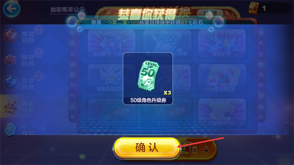 4、兌換還可獲得【50級角色升級券】,點擊確認領取,用于提升角色等級助力游戲進程。