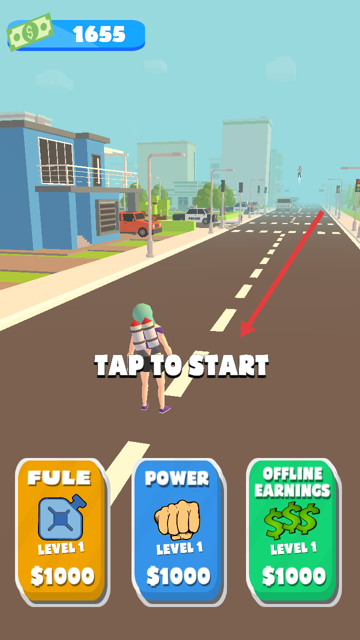 1、點擊TAPTOSTART,操控火箭角色在城市道路開始游戲,可升級燃料、力量、離線收益屬性。
