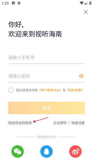 3、在登錄界面,選擇【短信驗證登錄】(也可選微信/QQ/微博等其他方式),進入短信登錄頁面。