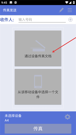 3、可在收件人欄輸入目標號碼,還能選擇【通過設備傳真文檔】或從移動設備選文件。
