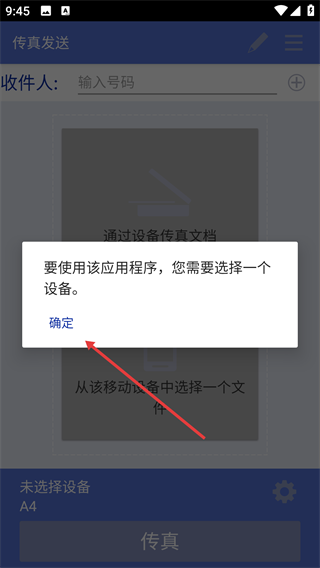 4、操作傳真功能時彈出“需選擇設備”的提示,點擊【確定】后,需先完成設備的選擇配置才能繼續操作。