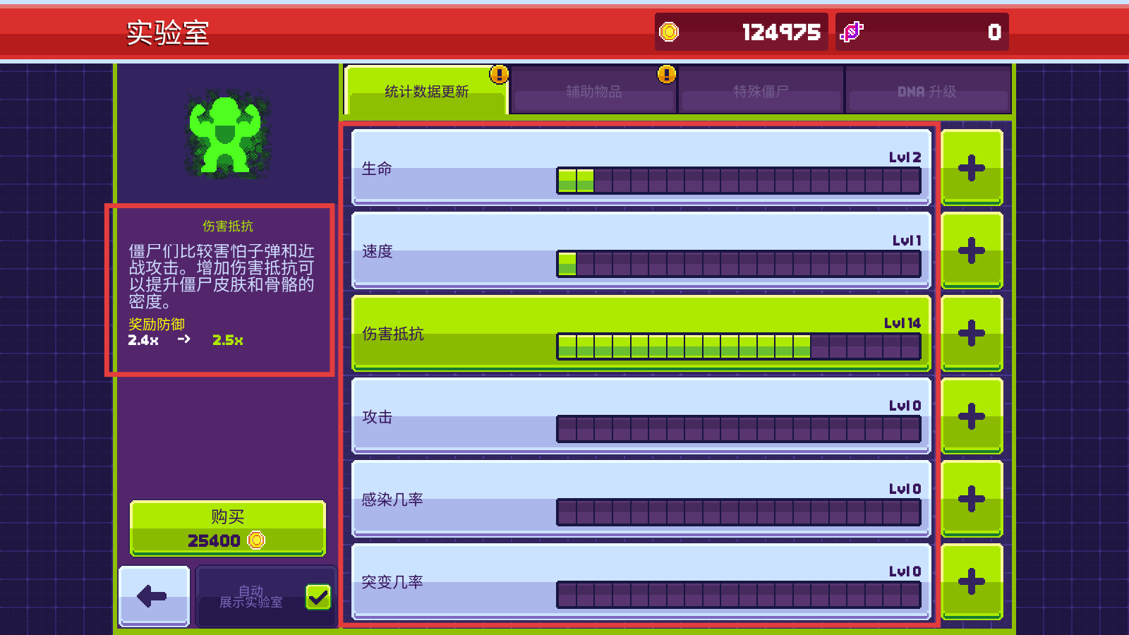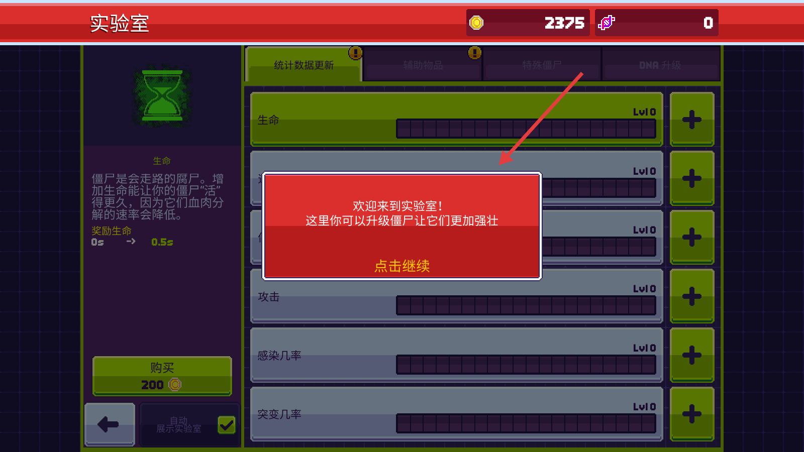 1、進(jìn)入實(shí)驗(yàn)室后點(diǎn)擊繼續(xù),可使用資源升級(jí)僵尸的生命屬性,讓它們?cè)趹?zhàn)斗中存活更久,提升整體作戰(zhàn)能力。