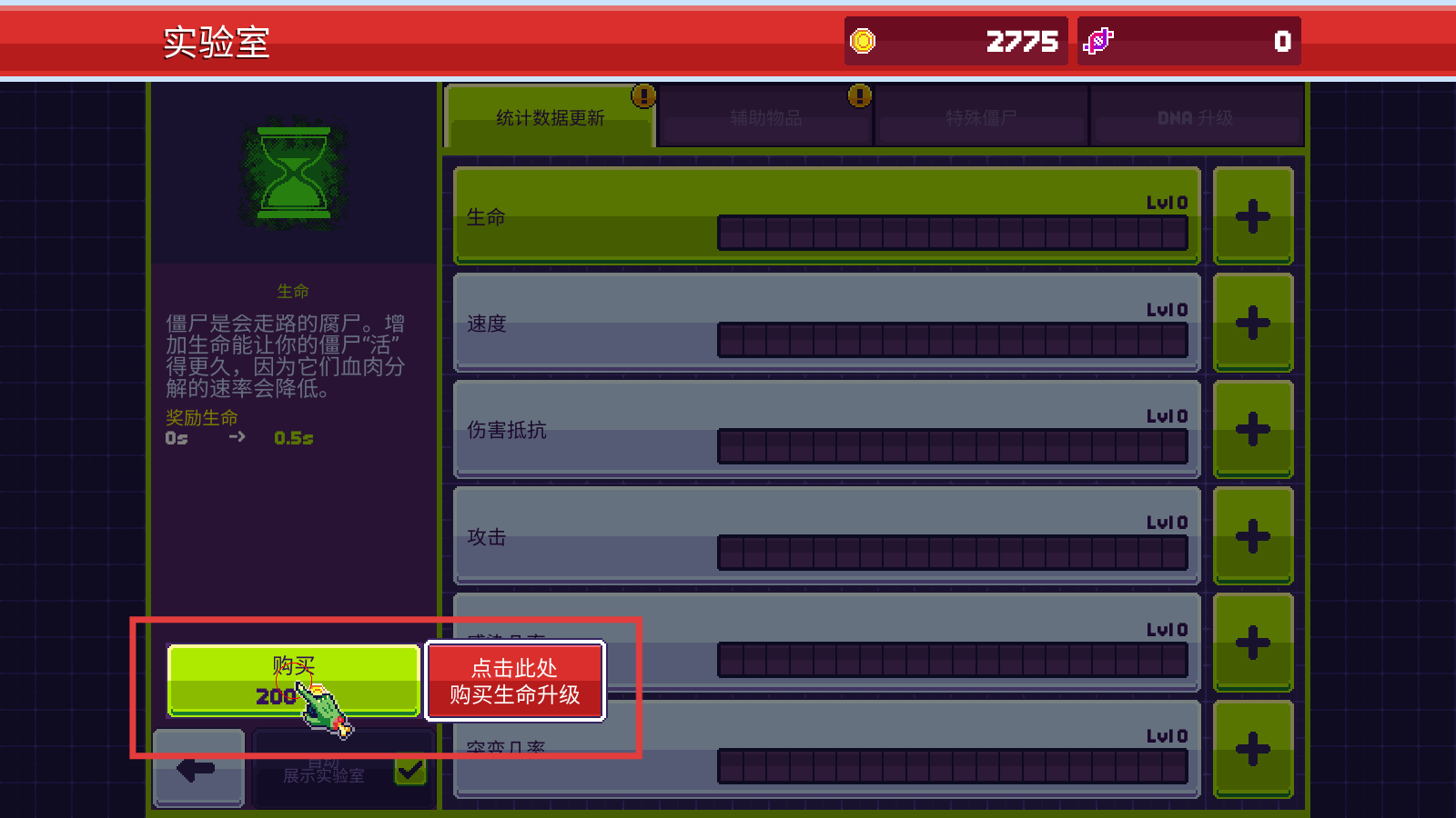 2、在實(shí)驗(yàn)室界面找到【購(gòu)買(mǎi)】按鈕,花費(fèi)【200】金幣升級(jí)僵尸生命,增強(qiáng)其生存能力,為后續(xù)戰(zhàn)斗打下基礎(chǔ)。