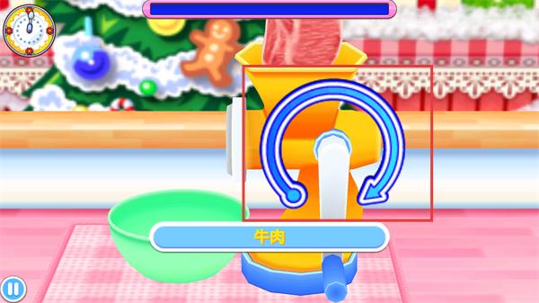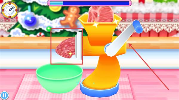 2、面對(duì)【絞肉機(jī)】與【牛肉】,按界面提示進(jìn)行旋轉(zhuǎn)操作,讓絞肉機(jī)處理牛肉,逐步完成肉糜初步制作。