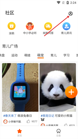 1、在社區頁面,點擊右上角的人物圖標,進入“我的”頁面。