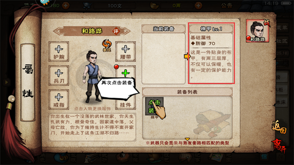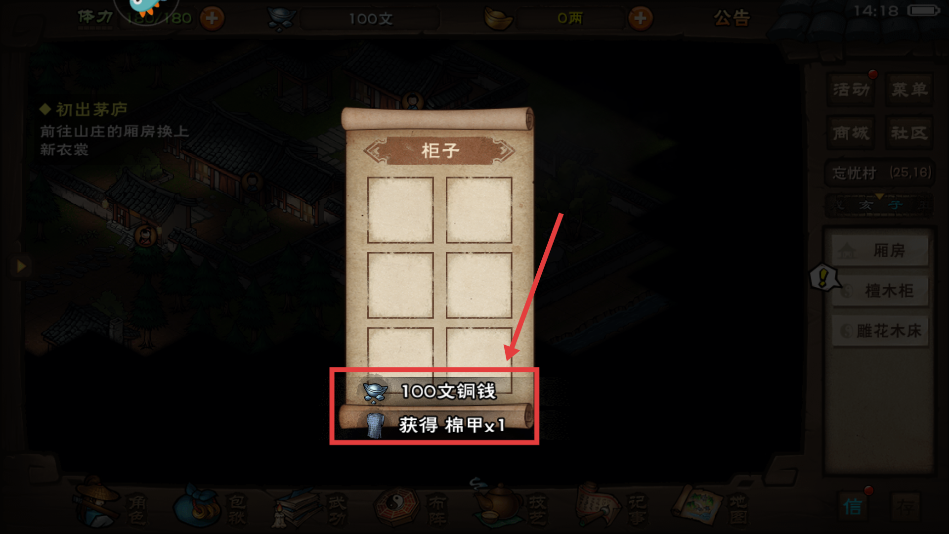 1、打開【柜子】可獲取【100文銅錢】與【棉甲x1】,這是前期提升裝備的重要途徑,能快速增強生存能力。