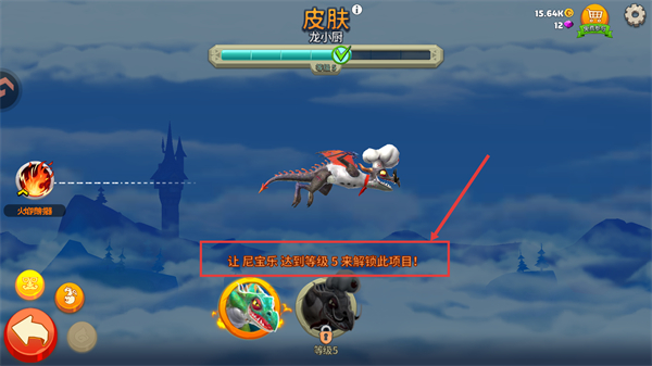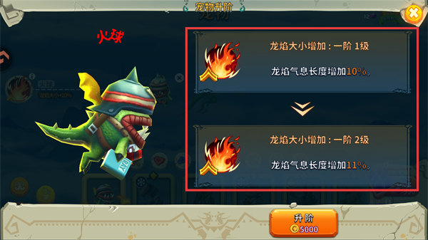 2、消耗【5000】金幣為寵物升階,解鎖【火球】技能,提升龍焰大小與氣息長度,增強輸出能力。