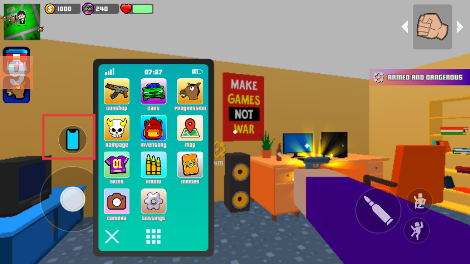1、點擊手機圖標,打開功能菜單,利用武器店、地圖等功能,輔助游戲進程。
