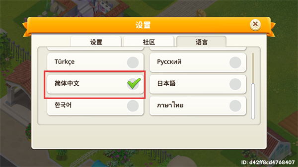 3、【設置】界面切換至【語言】標簽,選中紅框的【簡體中文】,將游戲界面改為中文更便于操作。