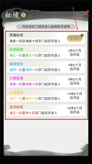 2、進入【秘境】界面后選擇【黑魔秘境】,可安排【魂者一段】至【魂者十段】的宗門成員進入探尋寶物。