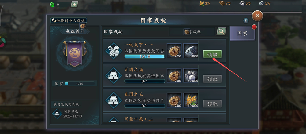 2、進入【國家成就】界面,領取【一統天下】獎勵,獲取貨幣與木材。