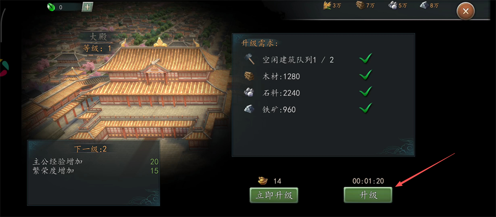 3、接著點擊大殿的【升級】按鈕,消耗資源提升大殿等級,解鎖更多建筑位。