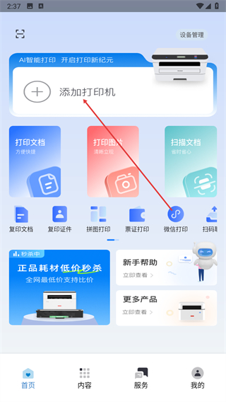 1、打開聯想至像打印應用,在首頁點擊添加打印機選項。